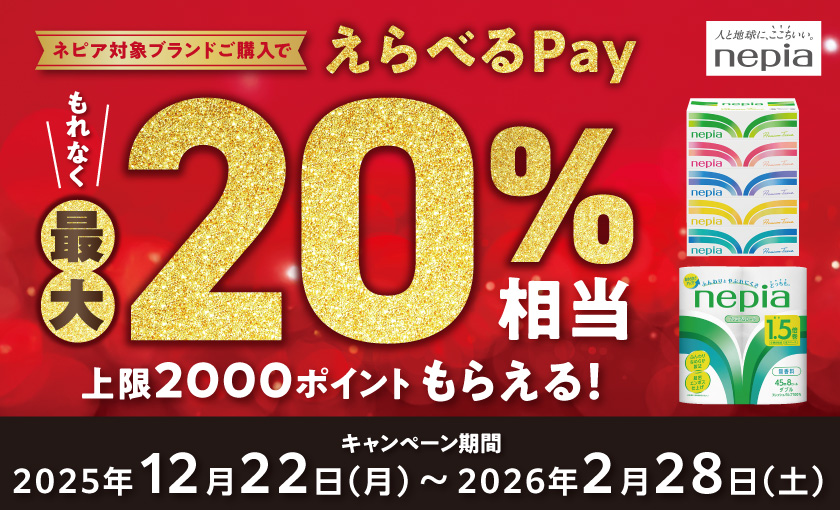 対象商品ご購入金額の最大20%相当の「えらべるPay」がもれなくもらえるキャンペーン! 応募締め切りは2026年2月28日!